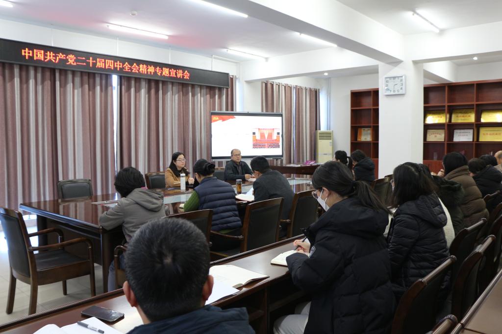 2025年12月18日下午,图书馆党总支组织党的二十届四中全会精神宣讲会,学校宣讲团成团、马克思主义学院副教授马欣欣作专题宣讲。宣讲会由图书馆党总支书记李国富主持,馆长胡杨及全体在岗馆员参加学习,旨在深刻领会全会精神,推动工作实践。